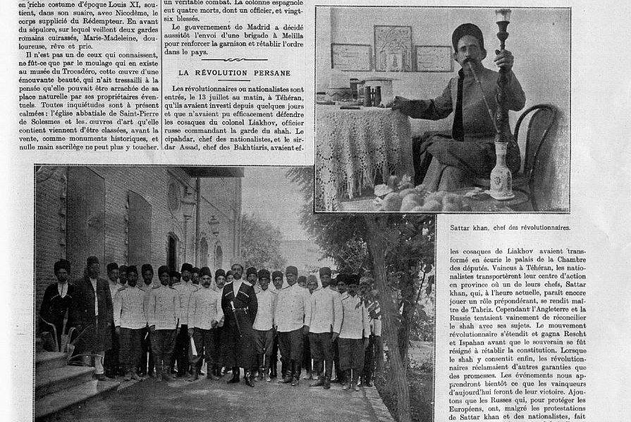 عکس بزرگ صفحه سرهنگ روسی لیاخوف (فرمانده بریگاد قزاق ایرانی در خدمت دربار قاجار) در میان گروهی از سربازان قزاق را نشان میدهد که پس از به توپ بستن مجلس (تیر ۱۲۸۷) توسط او، نماد سرکوب مشروطهخواهان شده بود. عکس کوچکتر، ستارخان، سردار ملی را نشان میدهد که در حال سخنرانی برای یارانش است زیرنویس عکس او را «رئیس انقلابیون» مینامد.